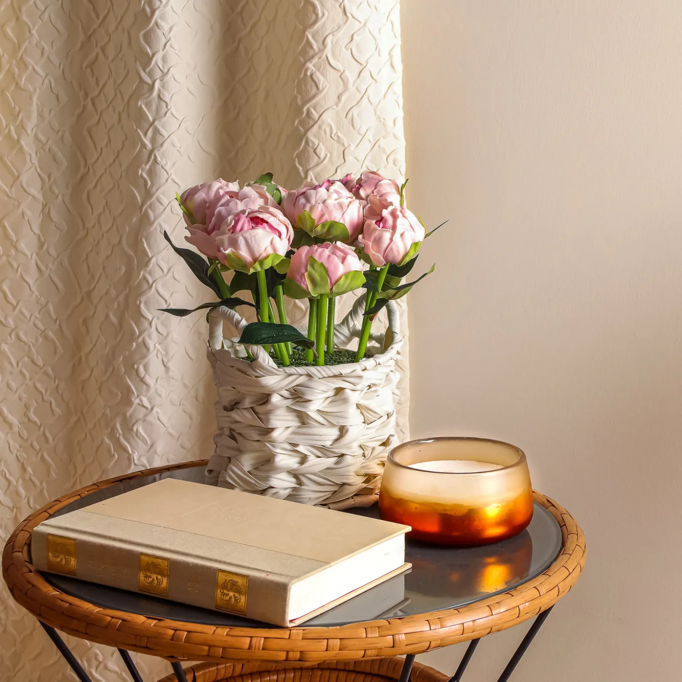 This bouquet of light pink peony flower blooms on leafy green stems rises from a white basket with a wide weave and two loop handles. The flowers are seated in a simulated soil surface. Add a burst of color to tabletop trimmings with these attractive artificial flowers that are remarkably life-like yet maintenance-free. For decorative indoor display.