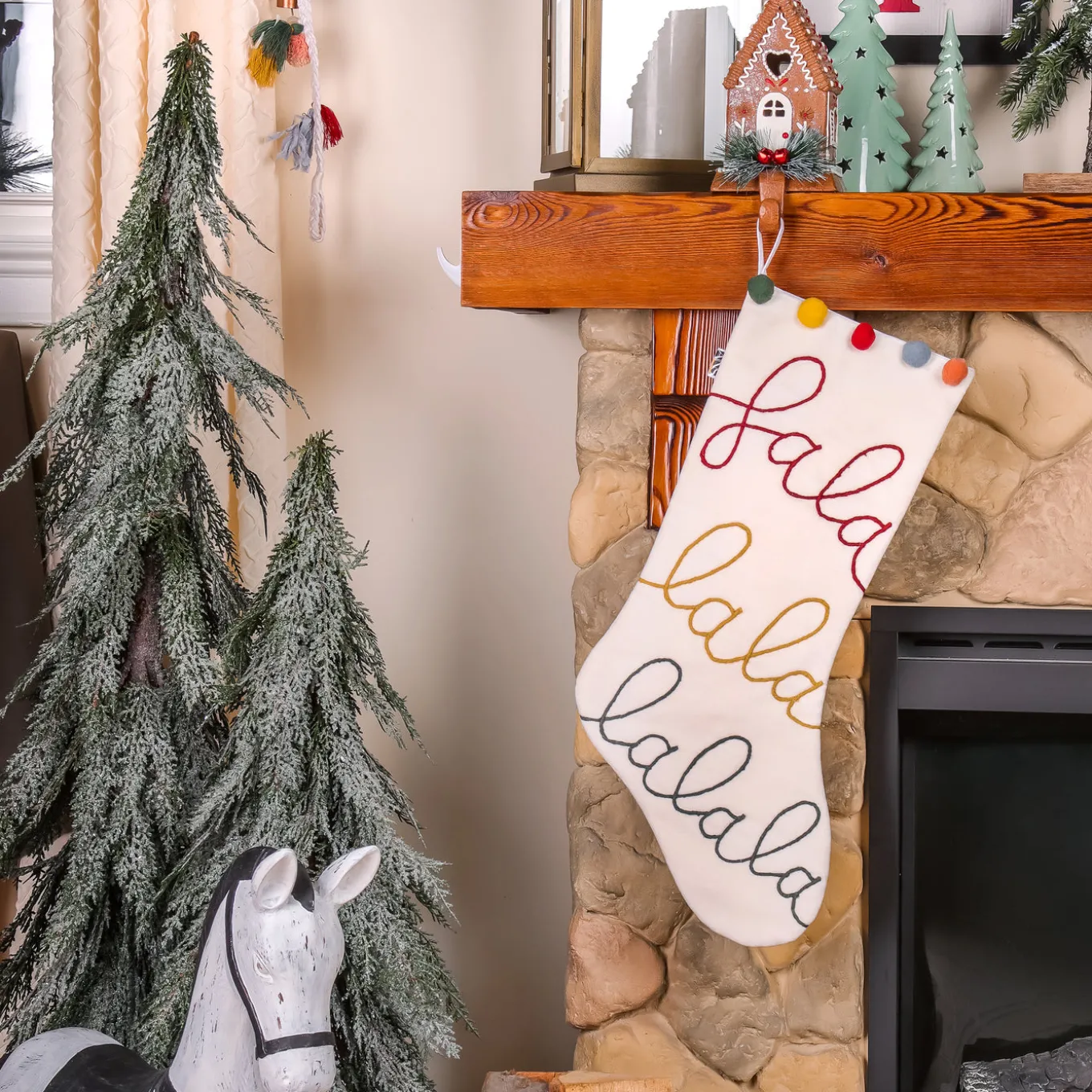 This HGTV Home Collection by National Tree Company white “Fa La La” stocking is a delightful holiday piece, featuring playful pom-poms for a whimsical touch. The crisp white color provides a clean, modern look, while the cheerful “Fa La La” text adds a festive message to your decor. Perfect for hanging by the fireplace or as part of a charming holiday display, this stocking is sure to bring joy and a touch of fun to your seasonal celebrations!