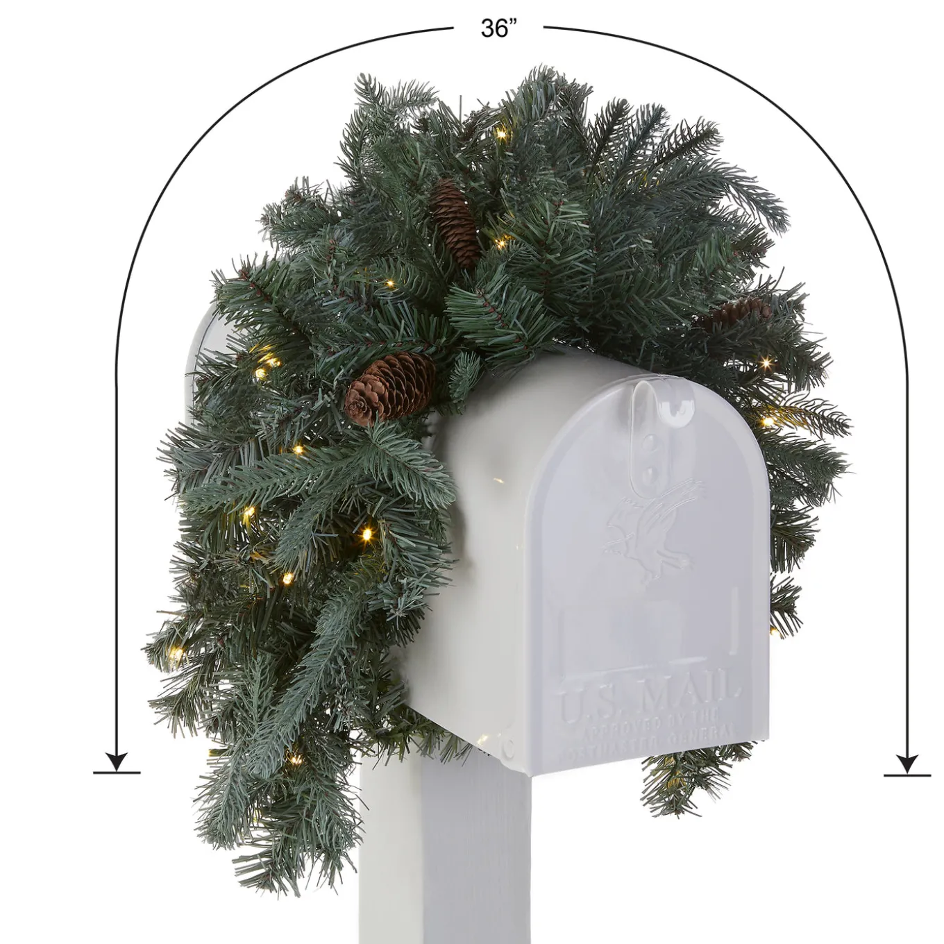 Put a smile on the mailman’s face and all who pass by with this Frosted Arctic Spruce Mailbox Swag. This holiday decoration features Feel Real branch tip technology, creating a decoration with remarkable realism. It is trimmed with pine cones and pre-strung with 35 battery operated warm white LED lights that are energy-efficient and long lasting. 6 hours ON/18 hours OFF timed operation. Includes tie wraps to secure swag to mailbox.