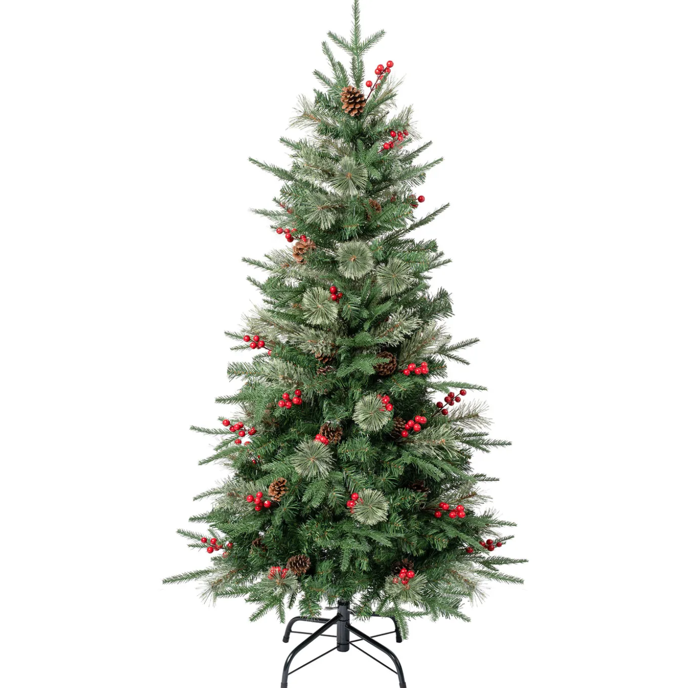 The Virginia Pine tree features Feel Real branch tip technology, creating a tree with remarkable realism. These crush-resistant branch tips are molded from real tree branches for an authentic living tree appearance. Branches are a mixture of evergreen and bristle tips that are trimmed with red berries and pinecones. Crafted with high quality materials and hinged branches for easy set up and includes a sturdy metal folding stand. For indoor display only.
