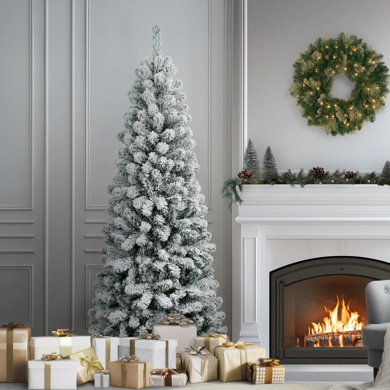 The Acacia tree offers a slim profile tree that is great for display in corners, small rooms and areas with limited space. This tree features flocked branches giving the appearance of freshly fallen snow. This tree features hinged branches for ease of assembly. Sturdy folding metal tree stand is included.