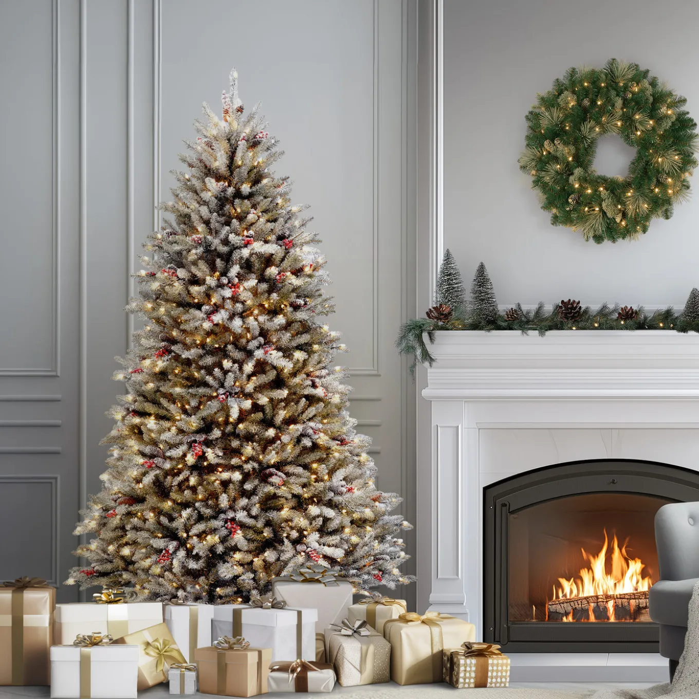 7.5 ft. Pre-Lit Dunhill Fir Flocked Tree with 750 Clear Lights