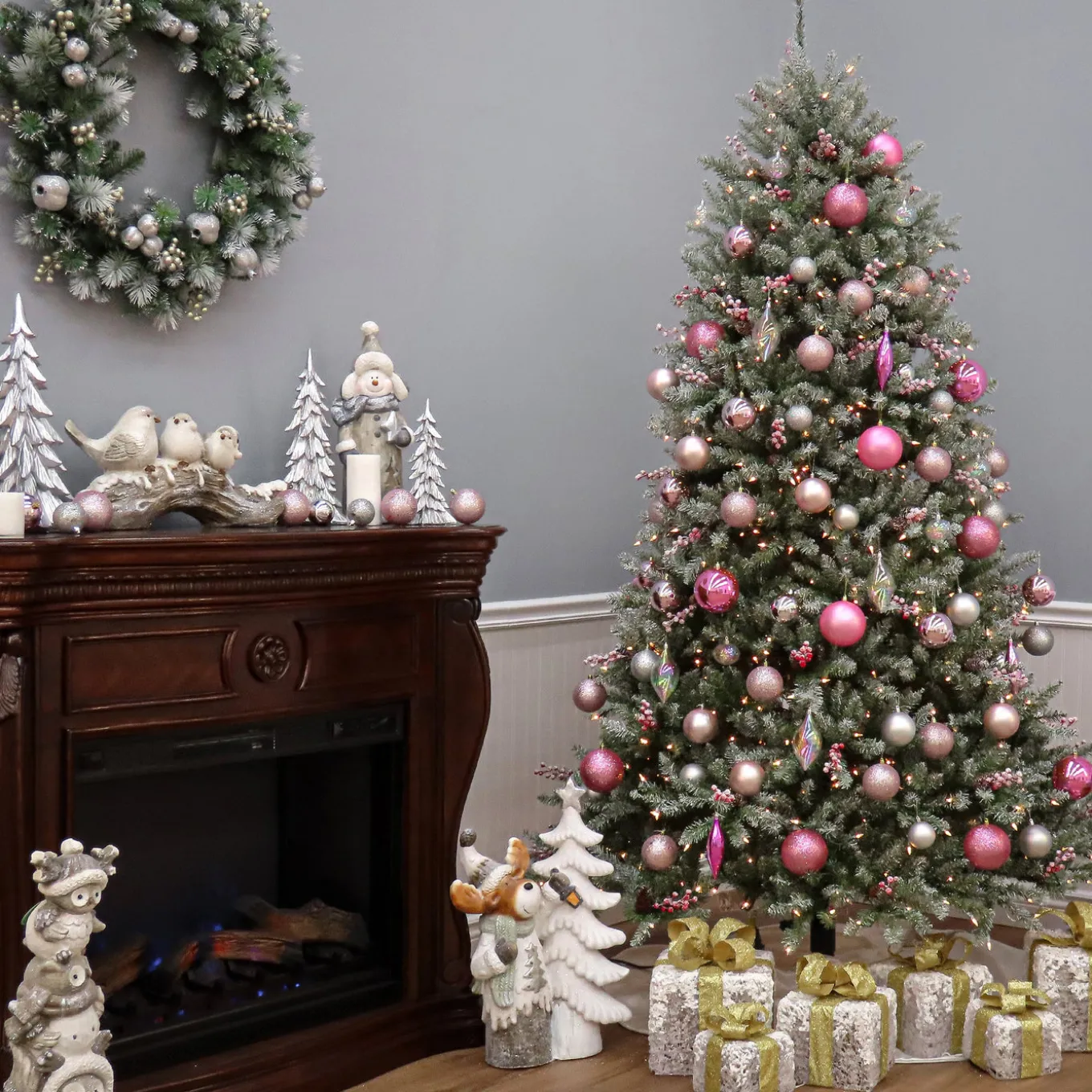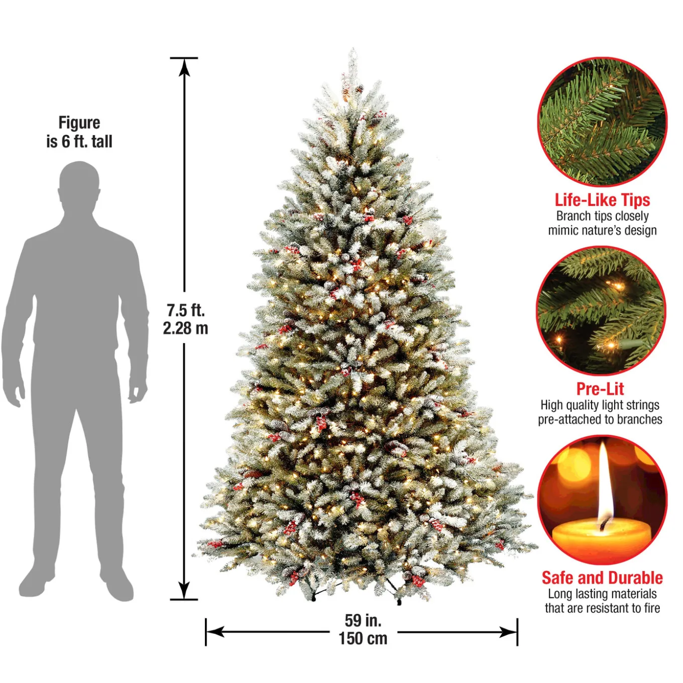 The Dunhill Fir tree features snow sprinkled branch tips and is trimmed with clusters of red berries and pinecones. It is pre-strung with 750 clear lights that remain lit even if a bulb burns out. This tree features hinged branch construction for ease of assembly. Sturdy metal tree stand is included.