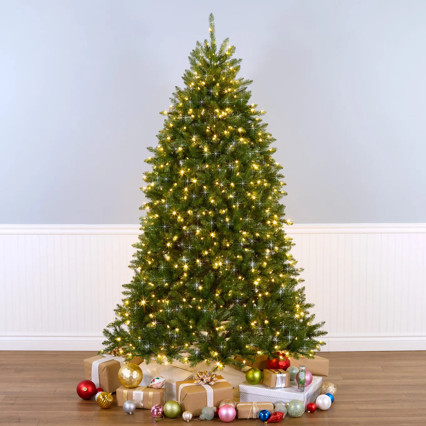 - Crafted with 2514 branch tips. Pre-Lit with 700 Dual Color LED lights with 10 functions and features PowerConnect through-the-pole lighting system.