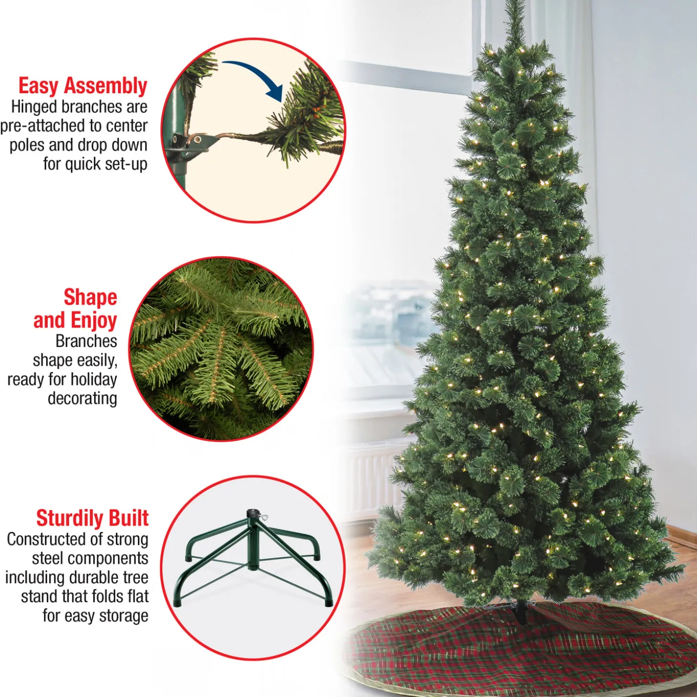 The Pilchuck Pine is a mixed branch tree featuring soft bristle tips. The slim profile makes it a great choice for display in corners or areas with limited floor space. It is pre-strung with 450 warm white LED lights that are long lasting and energy efficient. This three-section tree is designed with hinged branches for ease of assembly. Sturdy folding metal tree stand is included.