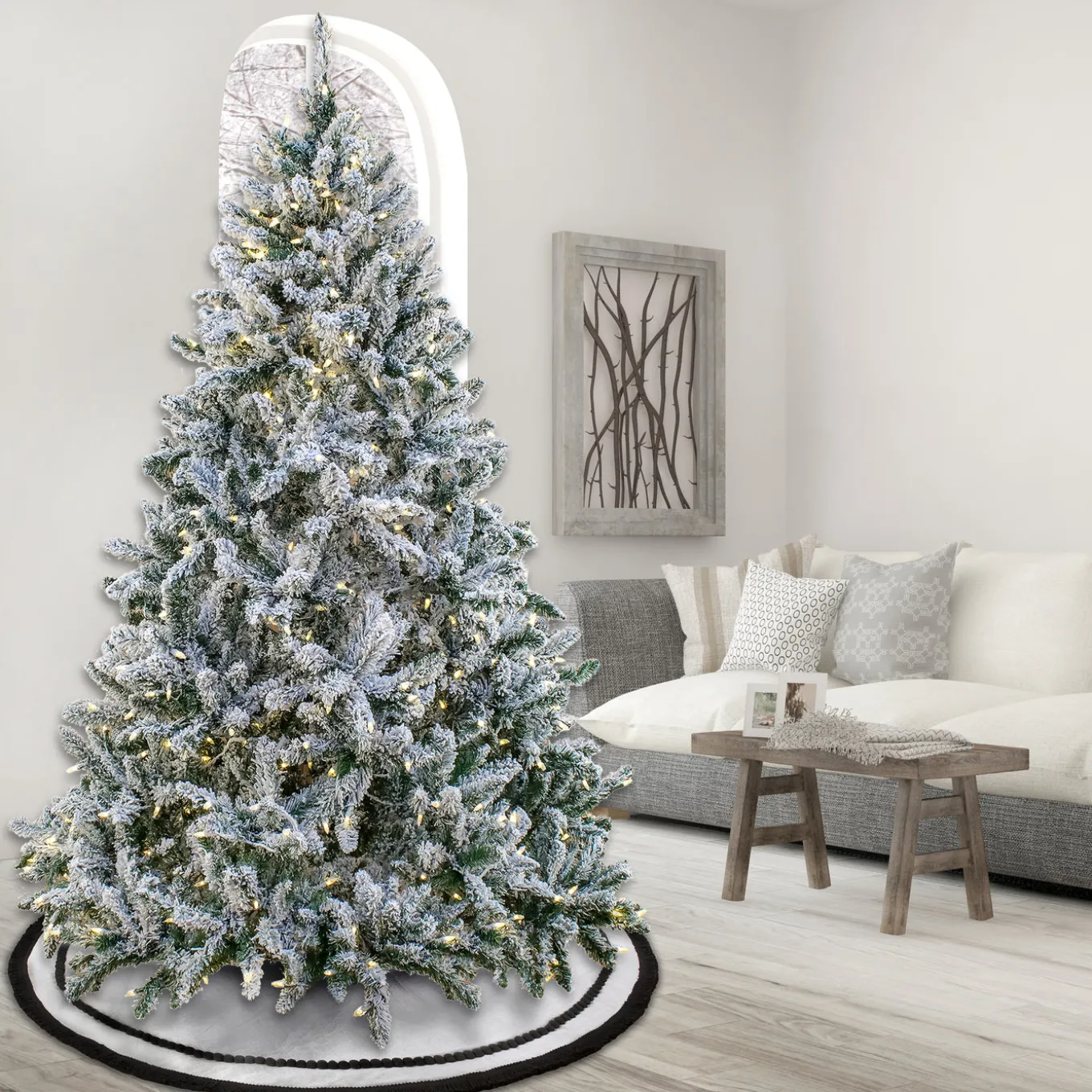 The Snowy Hudson tree is a full body tree featuring a generous number of flocked branches for the look of freshly fallen snow. It features the PowerConnect through-the-pole lighting system that eliminates the need for connecting multiple light strings. It is pre-lit with 800 Dual Colorlights that change from warm white to multicolor with the touch of a button. Included is a foot pedal switch to control 10 different light colors and actions. Crafted with high quality materials and hinged branches for easy set up and includes a sturdy metal folding stand. For indoor display only.