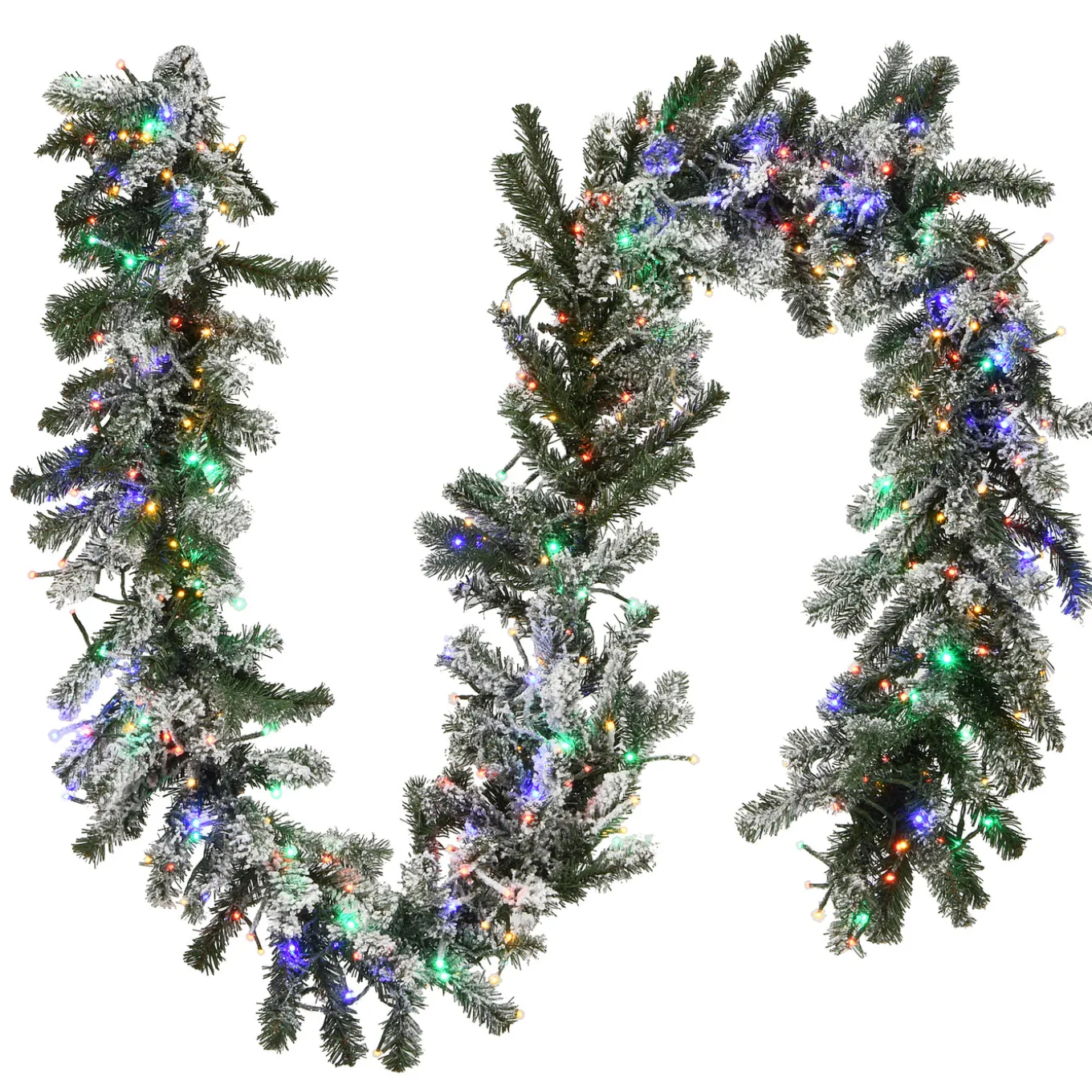 This snow-dusted Snowy Sheffield Spruce garland features Feel Real branch tip technology, creating a decoration with remarkable realism. It is lit with 400 Dual Color LED Cosmic Lights which are micro LED bulbs pre-lit at 4-times the volume found on garlands of comparable size. The integrated Dual Color system features a choice of ten different warm white and multicolor light functions. This garland can be displayed over doors, windows, fireplace mantels, fence, or stairway railings in indoor or covered outdoor locations.