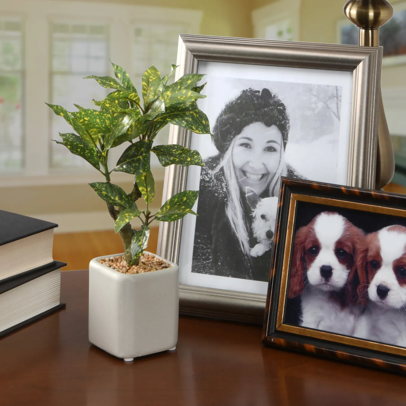 Large variegated green leaves sprout from the thick bark trunk of this attractive croton plant. It is seated in a square gloss white pot base with simulated soil surface. This artificial plant appears to be living yet requires no maintenance, water or sunlight. Can be displayed in indoor or covered outdoor locations.