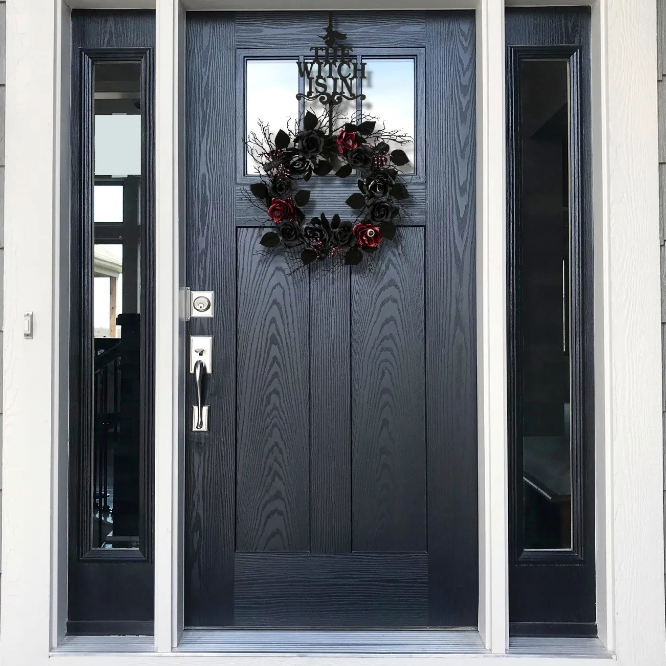 - This wreath hanger is painted with a matte black finish and features the message, ‘The Witch Is In’ that rests above the wreath