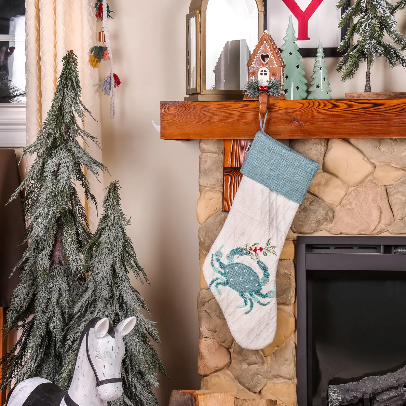 This HGTV Home Collection by National Tree Company white coastal stocking features an adorable blue crab design, accented by a stylish blue cuff. The bright white background creates a fresh and airy look, perfect for beach-themed holiday decor. Ideal for hanging by the fireplace or adding a unique touch to your seasonal display, this stocking captures a fun coastal vibe, making it a delightful addition to your festive celebrations!