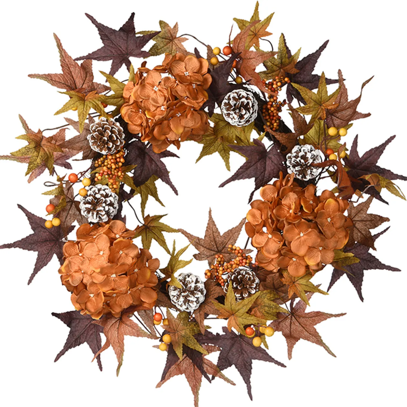 - Autumn themed wreath made with a woven branch base and adorned with beautiful, authentic feeling harvest hydrangea blooms, red and yellow berry clusters, pinecones and a colorful swirl of purple, orange and green maple leaves.