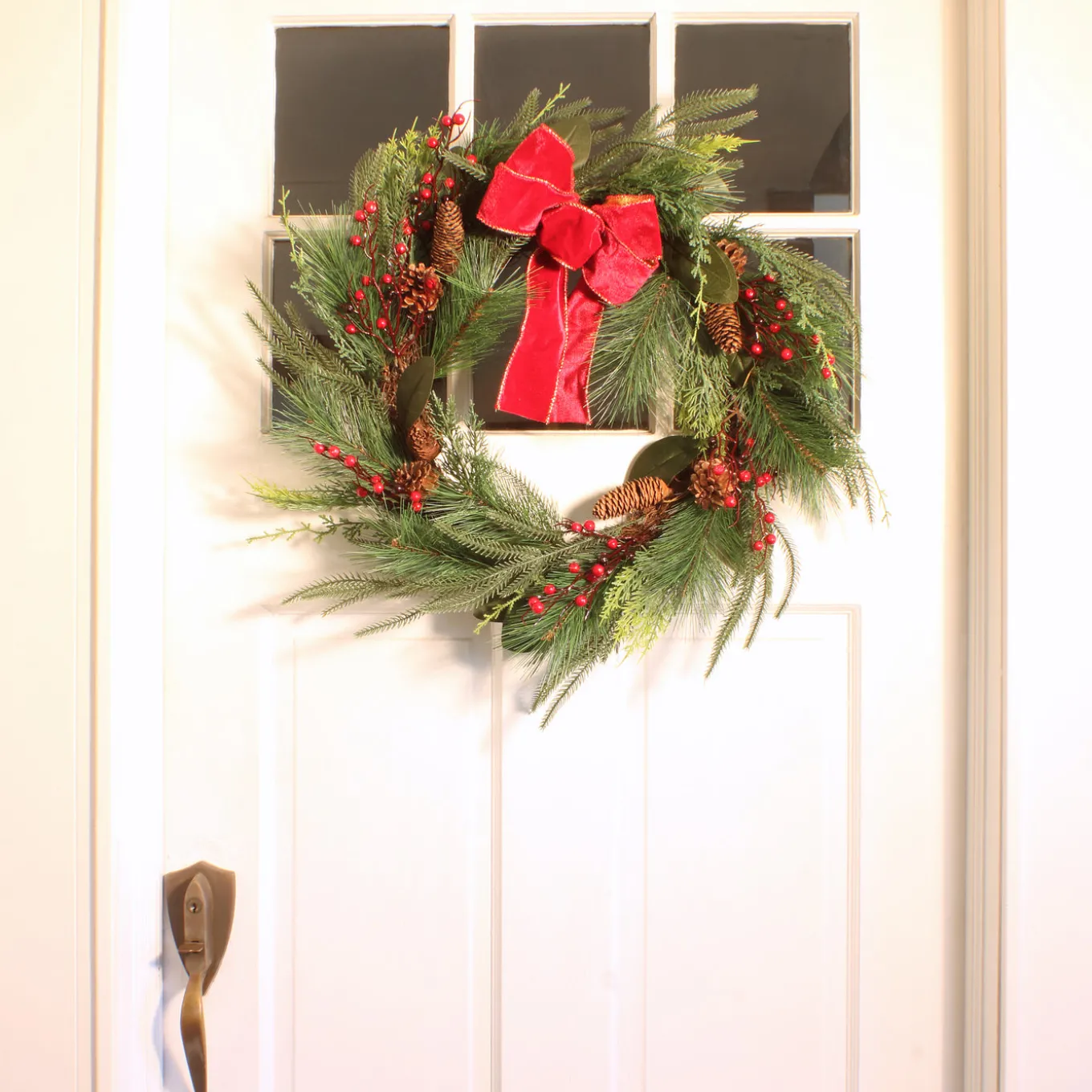 - Trimmed with red berries, pinecones, and red bow