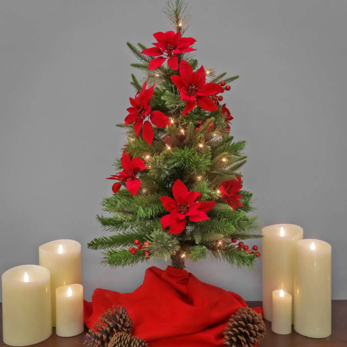 This Colonial Fir Pencil Slim tree features Feel Real branch tip technology, creating a tree with remarkable realism. These crush-resistant branch tips are molded from real tree branches for an authentic living tree appearance. This mixed tip tree is pre-lit with 50 clear lights that remain lit even if a bulb burns out, and is trimmed with red poinsettias and red berries. Crafted with high quality materials and hinged branches for easy set up and includes a sturdy metal folding stand. For indoor display only.
