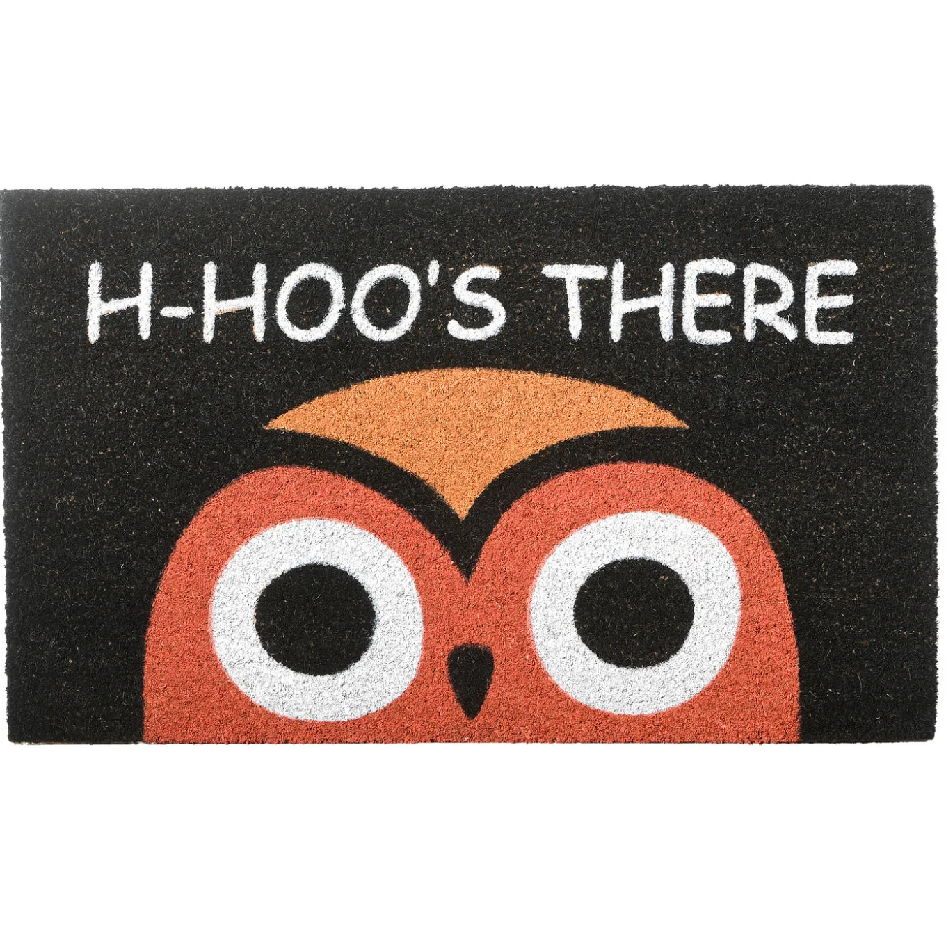 - Halloween themed decorative floormat that depicts an adorable owl saying ‘H-HOO’S THERE’.