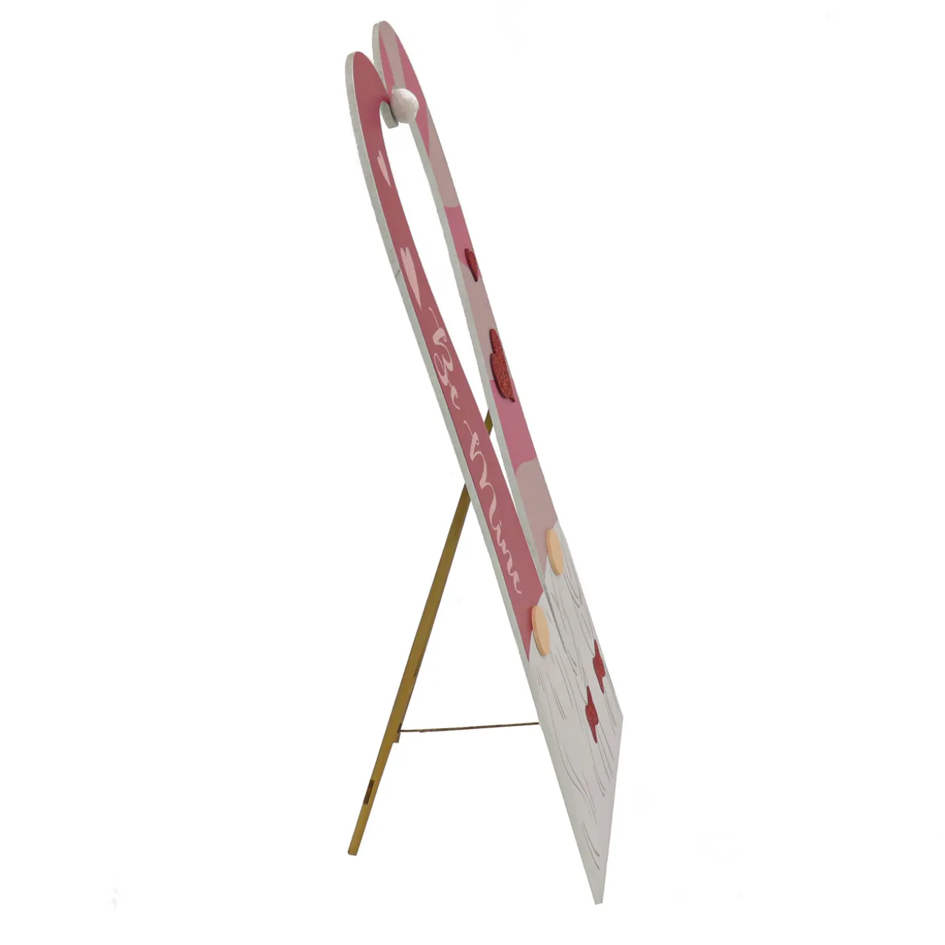 Get in the spirit of Valentine’s Day with this unique standup decoration. It is constructed of lightweight composite wood material and features a male and female gnome wearing tall caps that meet at the top to form a heart. Assorted glittered hearts decorate each cap, along with the message “Be Mine” written in flowing script. A fold out easel attachment on back supports a standing position. For display in indoor or covered outdoor locations.