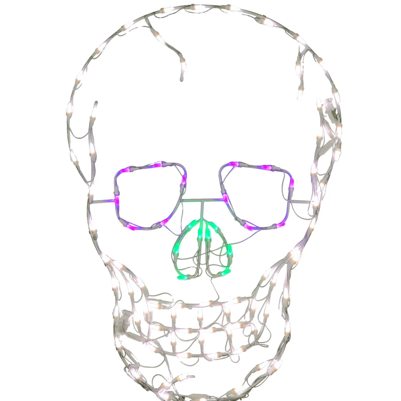 - The decoration depicts a frame shaped in the outline of an eerie skull. The lights attached glow brightly in a combination of purple, white and green bulbs. To power the lights, simply plug into the nearest wall outlet