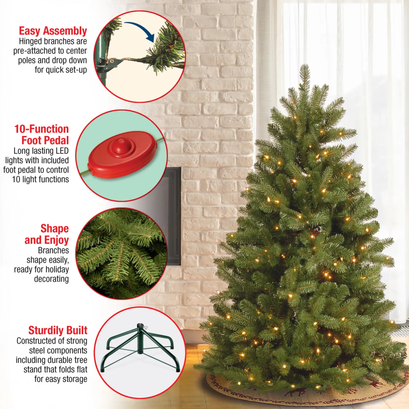 The Newberry Spruce tree features Feel Real branch tip technology, creating a tree with remarkable realism. These crush-resistant branch tips are designed from real tree branches for an authentic living tree appearance. This tree is pre-strung with 500 Dual Colorlights that change from warm white to multicolor with the touch of a button. Included is a foot pedal switch to control 10 different light colors and actions.This tree features hinged branch construction for ease of assembly. Sturdy metal tree stand is included.