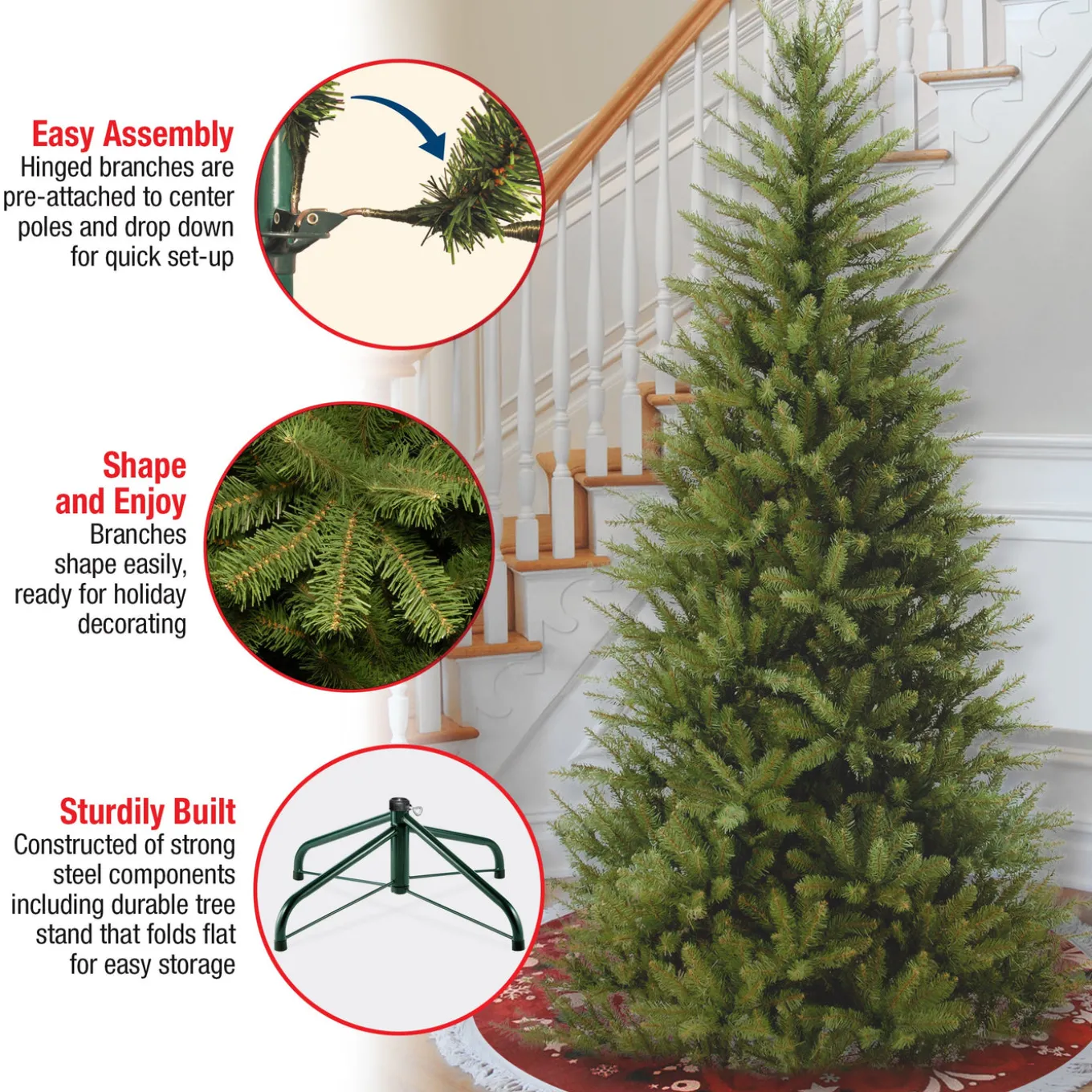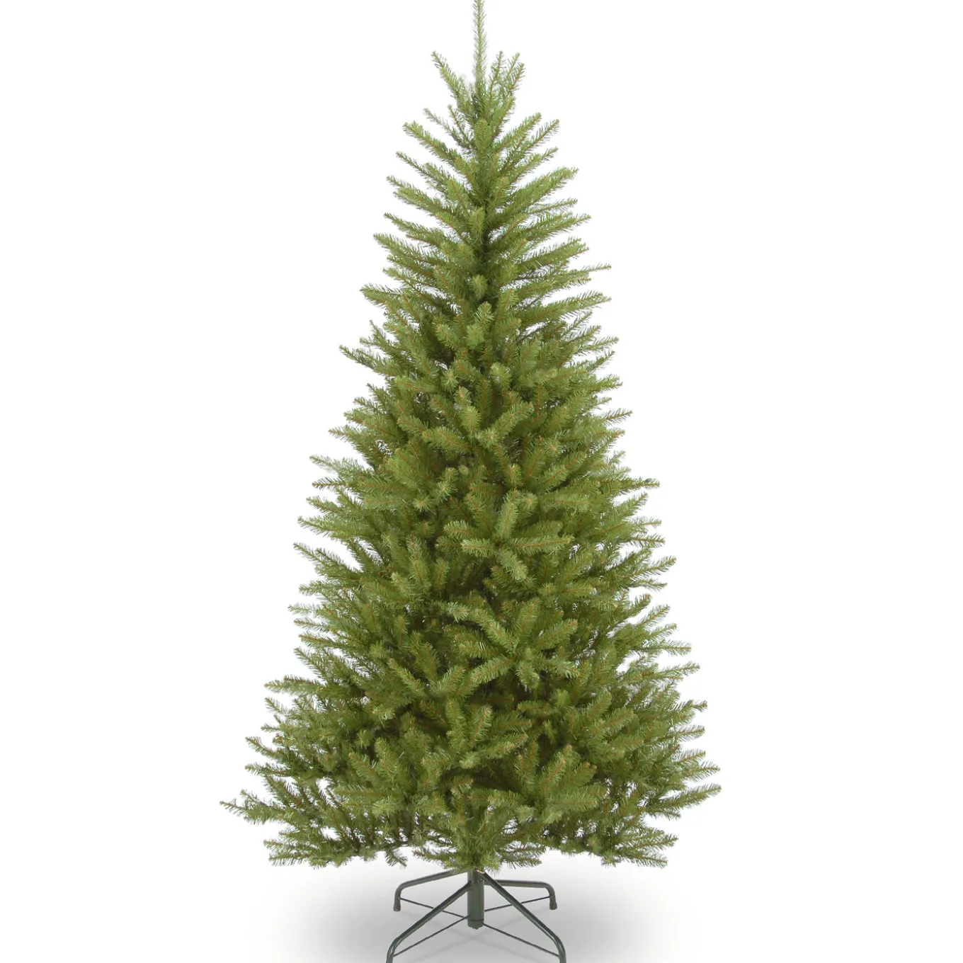 The Dunhill Fir is a slim profile tree that is a great choice for display in corners, small rooms or areas with limited floor space. This tree features hinged branch construction for ease of assembly. Sturdy folding metal tree stand is included.