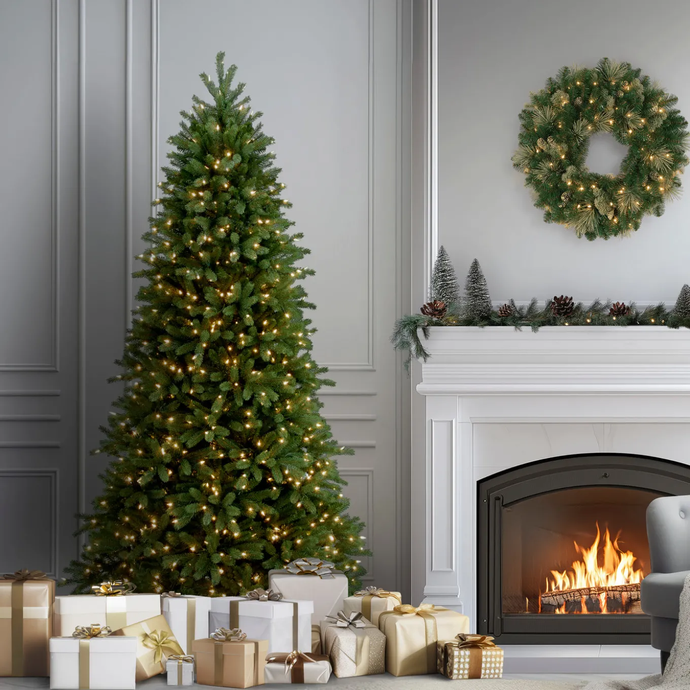This Jersey Fraser Fir tree features Feel Real branch tip technology, creating a tree with remarkable realism. These crush-resistant branch tips are molded from real tree branches for an authentic living tree appearance. This full-bodied tree is pre-strung with 700 clear lights that remain lit even if a bulb burns out. The slim profile allows for a better fit in corners or limited space areas. This tree features hinged branch construction for ease of assembly. Sturdy metal tree stand is included.