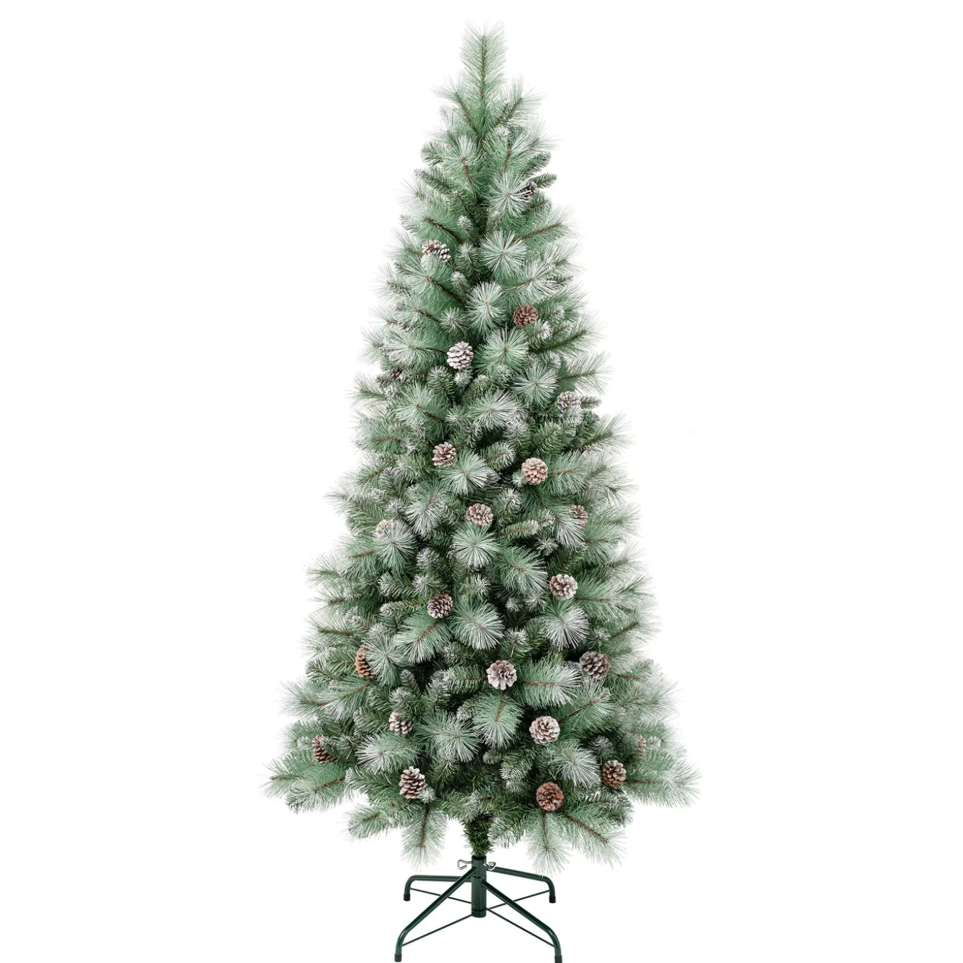The Perry Hard Needle tree features a mix of snow-dusted evergreen and bristle branch tips and is trimmed with snow dusted pine cones. This is a full body tree featuring a generous number of branch tips for holding holiday trimmings. Crafted with high quality materials and hinged branches for easy set up and includes a sturdy metal folding stand. For indoor display only.