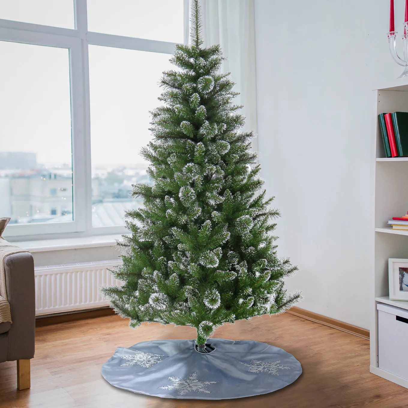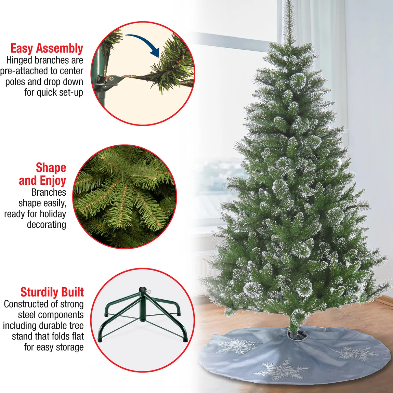 The Snowy Sierra Spruce is a full body tree featuring mixed branch tips that are lightly dusted with snow. The hinged branch construction of this two-section tree make assembly quick and easy providing many years of holiday enjoyment. Sturdy folding metal tree stand is included.