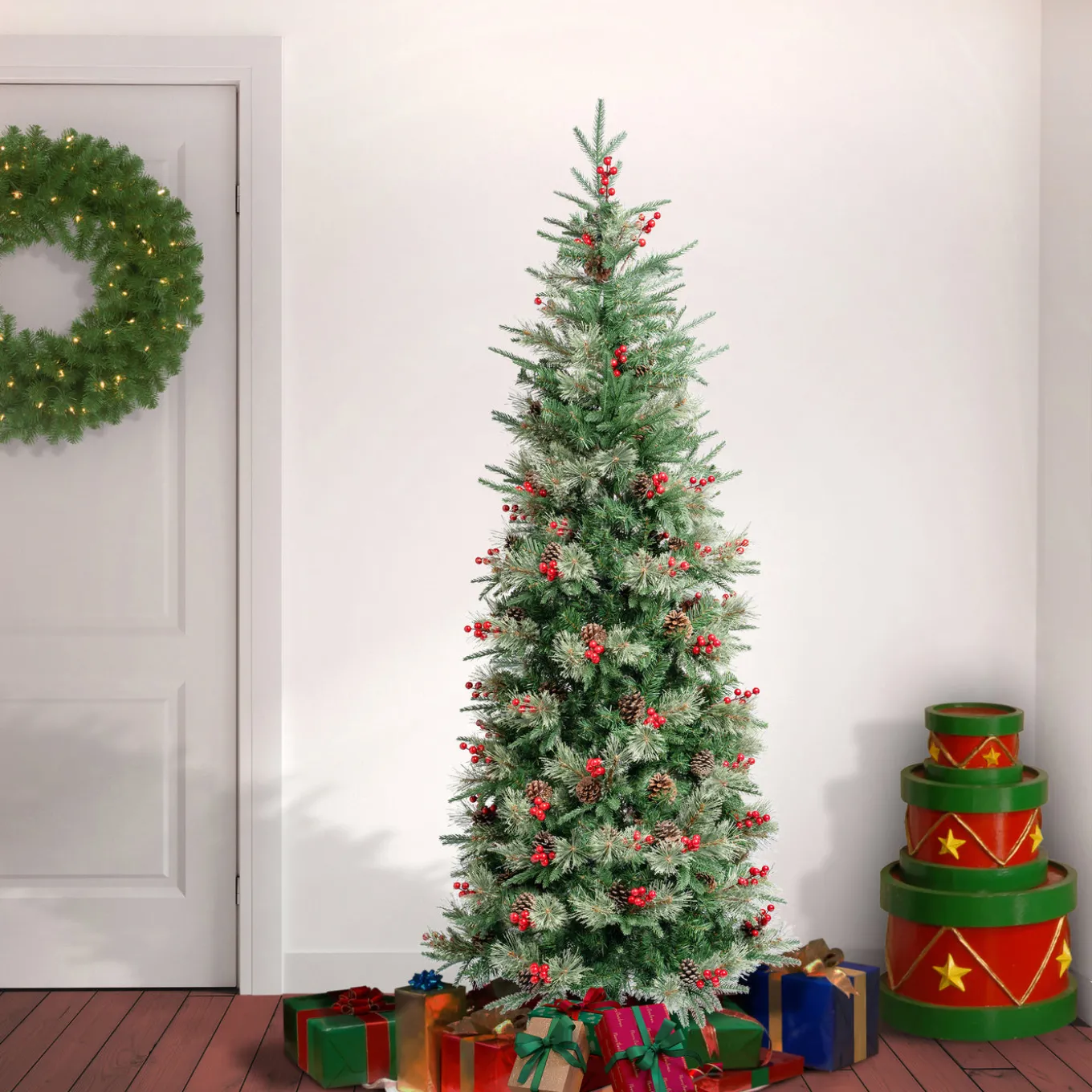 The Virginia Pine tree features Feel Real branch tip technology, creating a tree with remarkable realism. These crush-resistant branch tips are molded from real tree branches for an authentic living tree appearance. This slim silhouette tree is perfect for rooms with limited space. Branches are a mixture of evergreen and bristle tips that are trimmed with red berries and pinecones. Crafted with high quality materials and hinged branches for easy set up and includes a sturdy metal folding stand. For indoor display only.