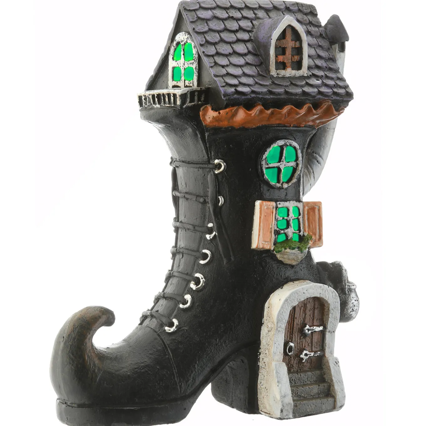 - Halloween themed decorative statue depicting a haunted boot house overrun by ghosts. One LED light illuminates the decoration.