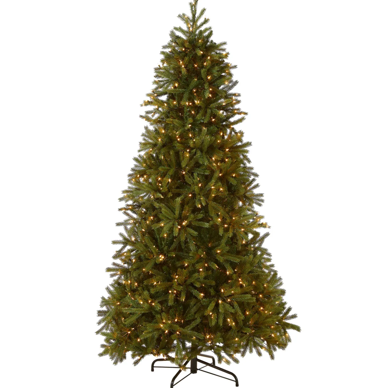 This Jersey Fraser Fir tree features Feel Real branch tip technology, creating a tree with remarkable realism. These crush-resistant branch tips are molded from real tree branches for an authentic living tree appearance. This full-bodied tree is pre-strung with 800 clear lights that remain lit even if a bulb burns out. The slim profile allows for a better fit in corners or limited space areas. This tree features hinged branch construction for ease of assembly. Sturdy metal tree stand is included.