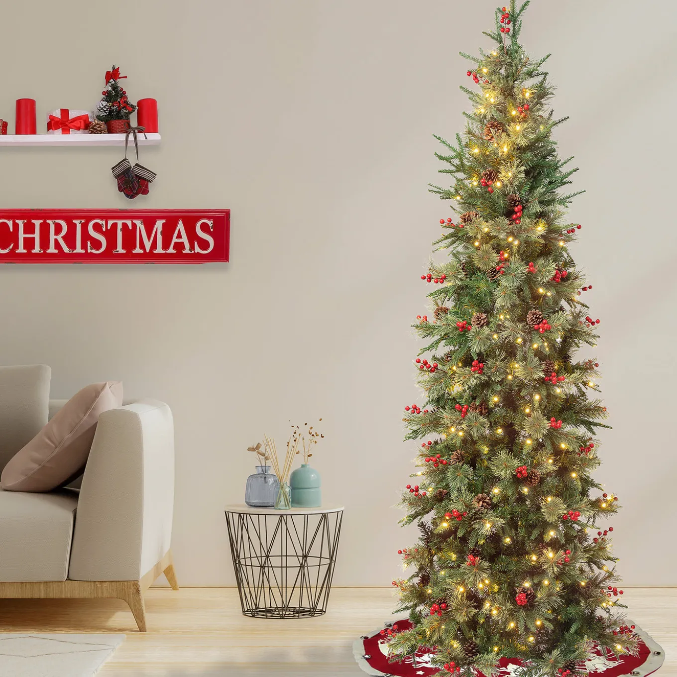 The Virginia Pine tree features Feel Real branch tip technology, creating a tree with remarkable realism. These crush-resistant branch tips are molded from real tree branches for an authentic living tree appearance. This slim silhouette tree is perfect for rooms with limited space. The branches are a mixture of evergreen and bristle tips that are trimmed with red berries and pinecones. It is pre-lit with 260 warm white LED lights that are long lasting and energy efficient. Crafted with high quality materials and hinged branches for easy set up and includes a sturdy metal folding stand. For indoor display only.