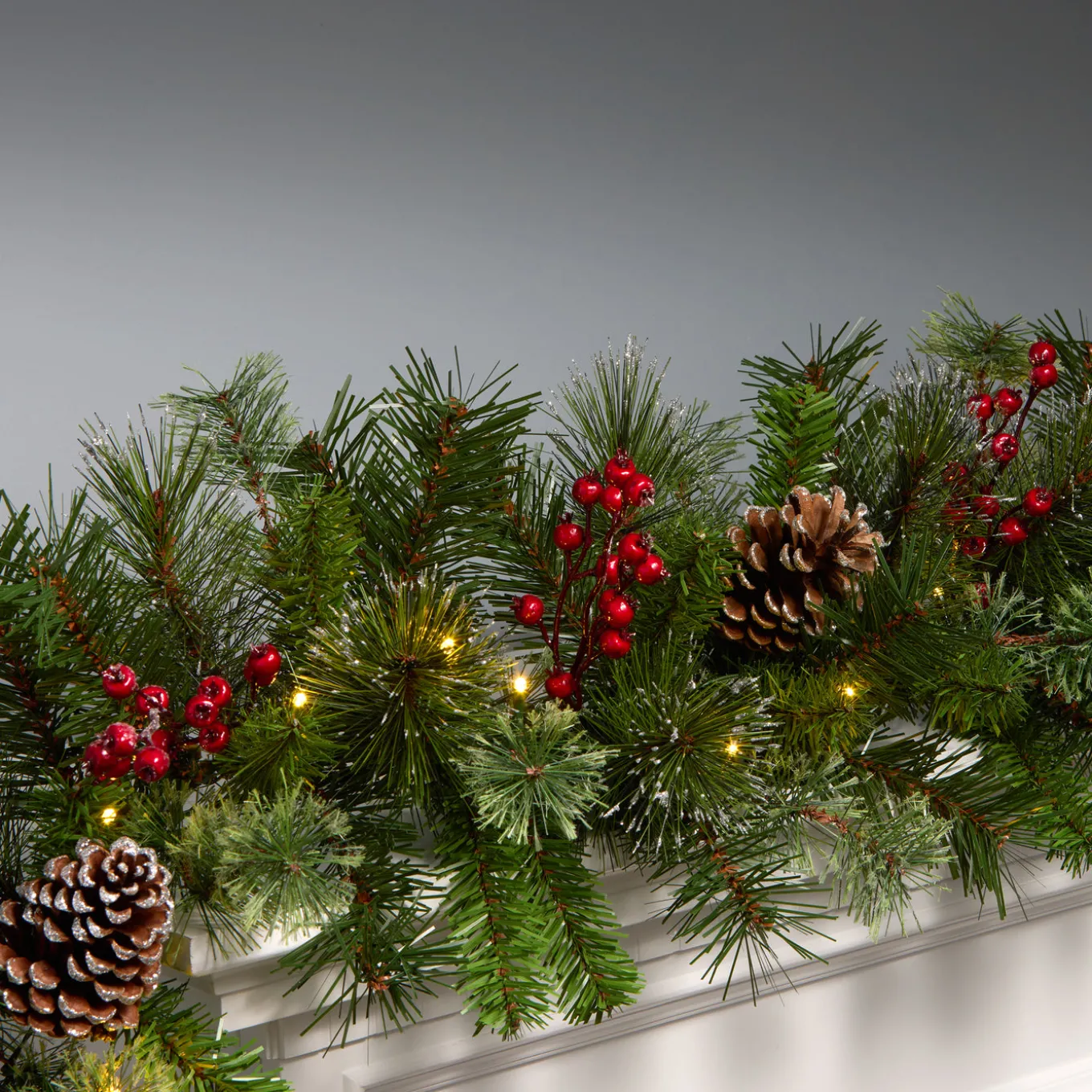 This charming Iced Berry Pine garland brings a timeless design to your holiday decorating. This garland is pre-lit with 50 battery opened warm white LED lights with a integrated 6 hours ON/18 hours OFF timer. It is decorated with iced red berries and glittered pine cones, this garland will bring holiday magic for many years. For indoor or outdoor display.