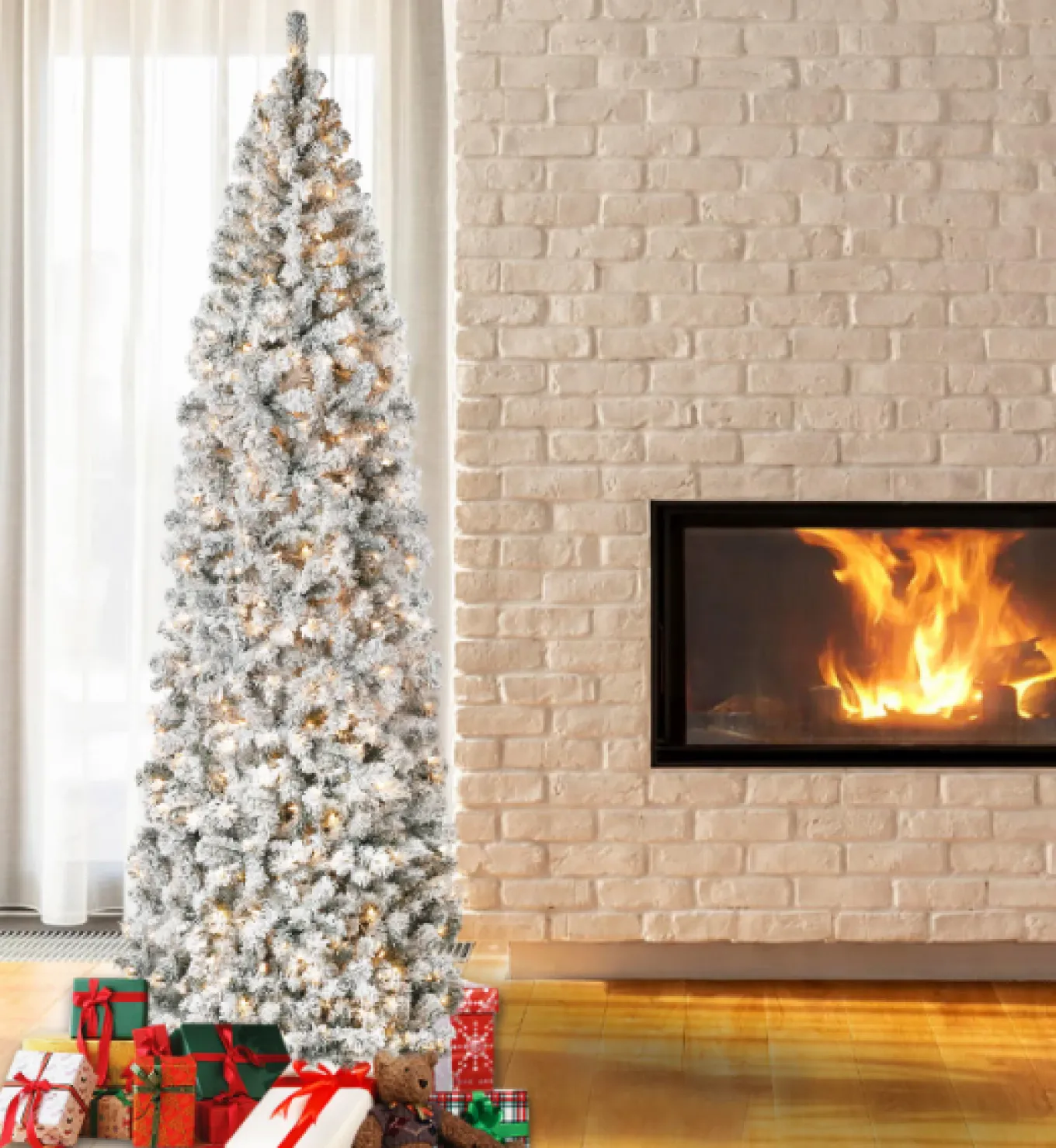 9 ft. Pre-Lit Acacia Flocked Slim Tree with Clear Lights