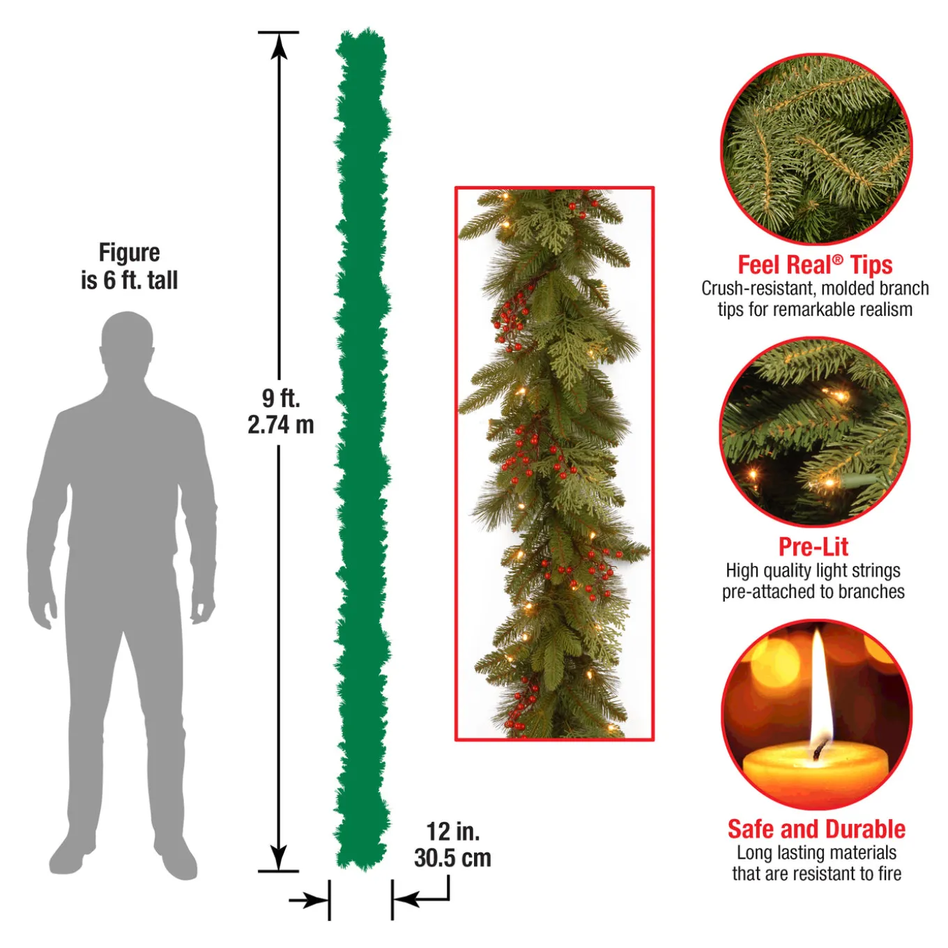 This Classical Collection garland features Feel Real branch tip technology, creating a decoration with remarkable realism. These crush-resistant branch tips are molded from real tree branches for an authentic appearance. This mixed evergreen tip garland is trimmed with cedar leaves and red berries and pre-lit with 100 clear lights. Display this indoor, outdoor decoration over doors, windows, fireplace mantels, fence, or stairway railings.