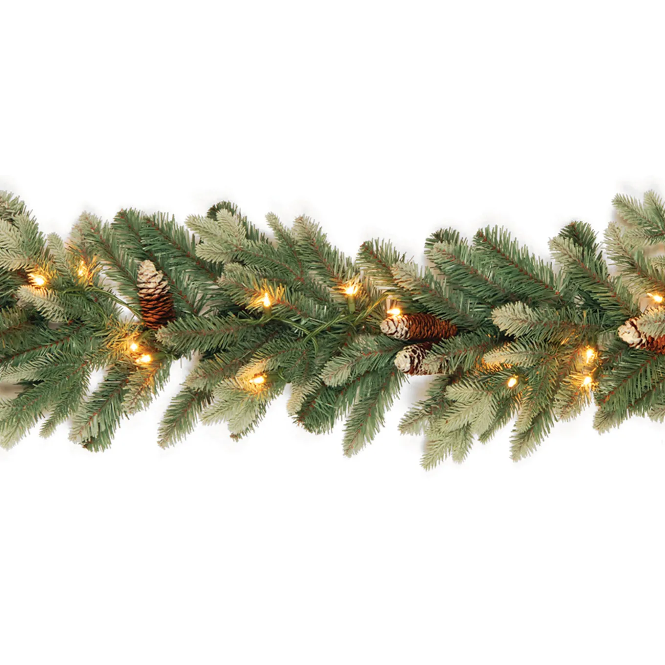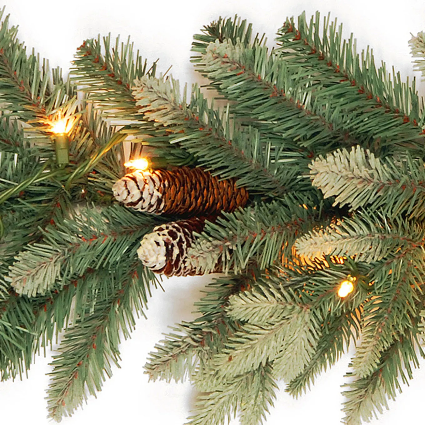 The Copenhagen Spruce garland features Feel Real branch tip technology, creating a decoration with remarkable realism. These crush-resistant branch tips are molded from real tree branches for an authentic appearance. It is a mixed tip garland that is trimmed with flocked pine cones and is pre-lit with 50 clear lights that remain lit even if a bulb burns out. This garland can be displayed over doors, windows, fireplace mantels, fence or stairway railings. For indoor or covered outdoor use.