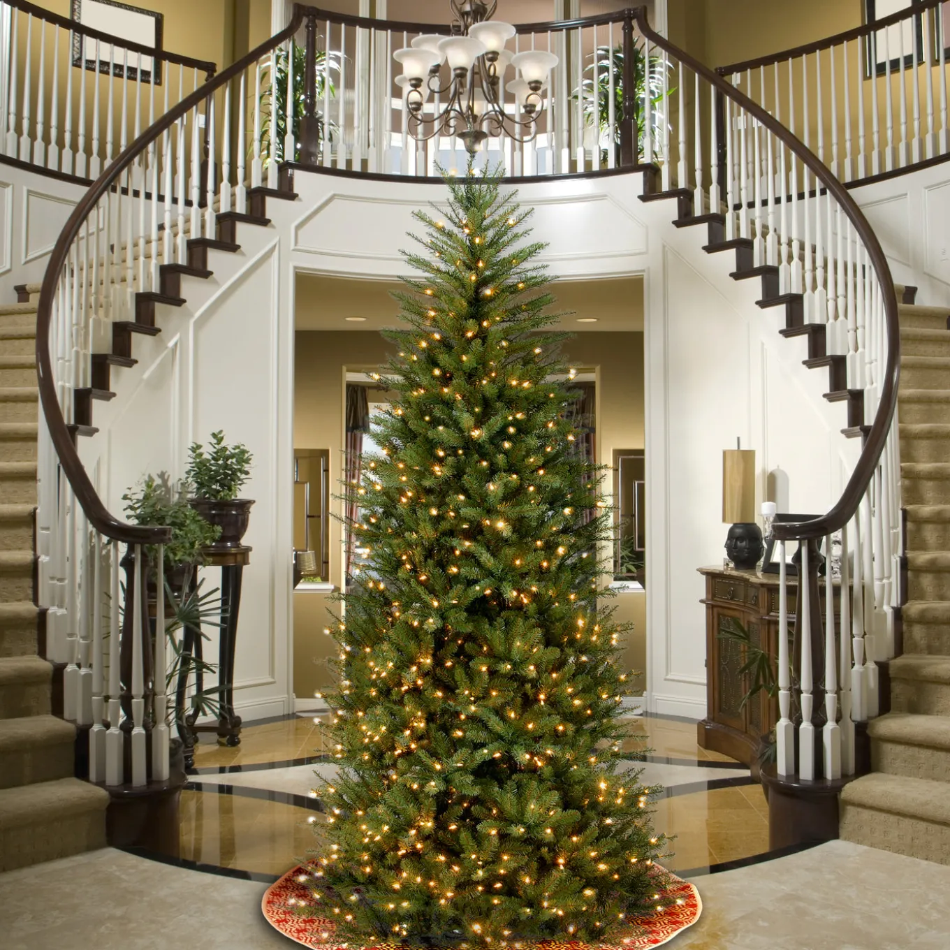 Though tall in height, this Dunhill Fir tree offers a slimmer profile which may make it better for display in corners or areas with limited floor space, compared to typical trees of similar height. It is pre-strung with 800 clear lights that remain lit even if a bulb burns out. This tree features hinged branch construction for ease of assembly. Sturdy folding metal tree stand is included.